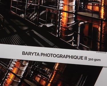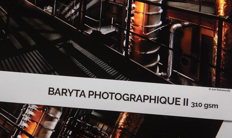 Baryta Photographique II possui camada de 100% sulfato de bário que garante contraste excepcional, ampla gama de cores e D-MAX elevado, resultando em pretos profundos e cores vibrantes. Sua superfície lembra o papel tradicional de câmara escura, com brilho fino e textura elegante, ideal para aplicações artísticas diversas.