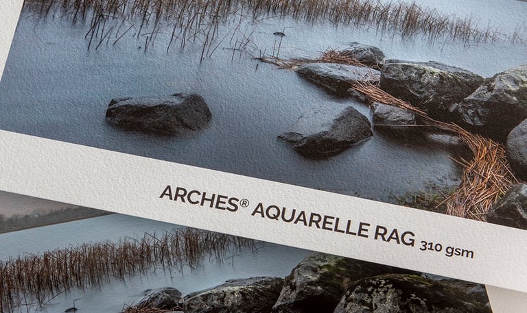 ARCHES® Aquarelle Rag é um papel Fine Art 100% algodão, fabricado na França com máquina tradicional de forma redonda desde ano de 1492. Sua textura natural e base branca sem branqueadores ópticos garantem pureza e toque refinado. A camada para jato de tinta proporciona cores vibrantes, pretos profundos e reprodução tonal excepcional.